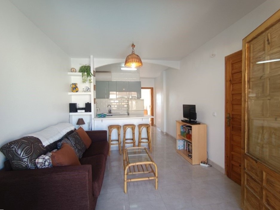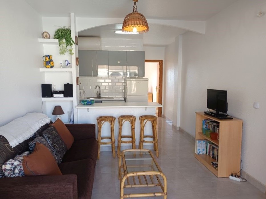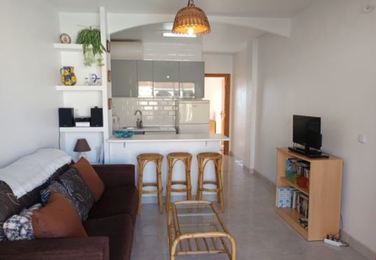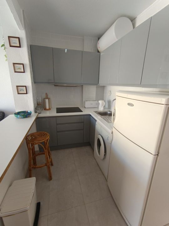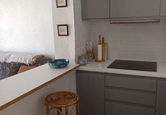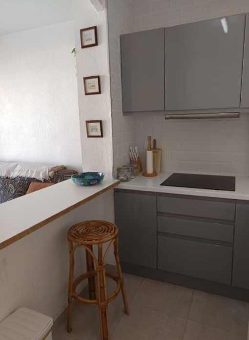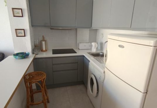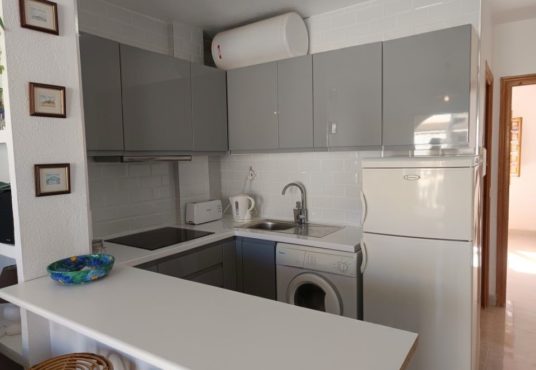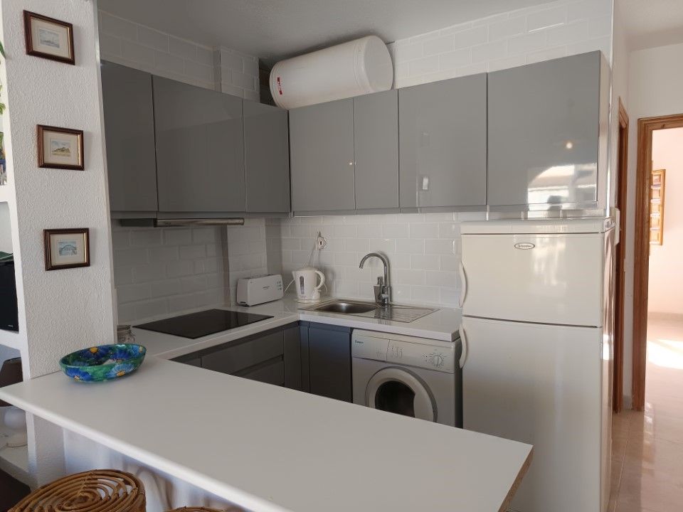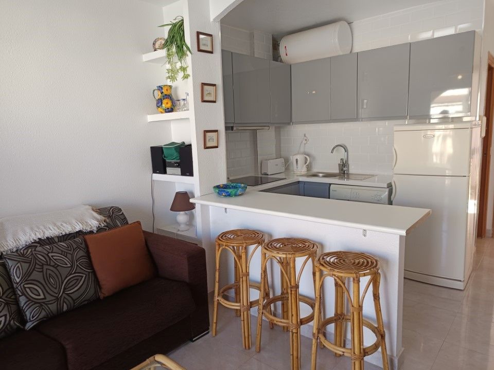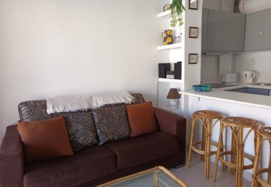 Se trata de un bonito apartamento de una habitación que se encuentra en muy buen estado para entrar a vivir. Es una vivienda con una habitación doble con armario empotrado, un cuarto de baño con ducha hecho recientemente y una cocina también nueva. Tiene un amplio salón comunicado con la terraza por unos grandes ventanales que hace el espacio mucho más luminoso y acogedor. Se vende totalmente amueblado y con todos los electrodomésticos. Es una comunidad con piscina y espacio exterior muy bonito y cuidado.